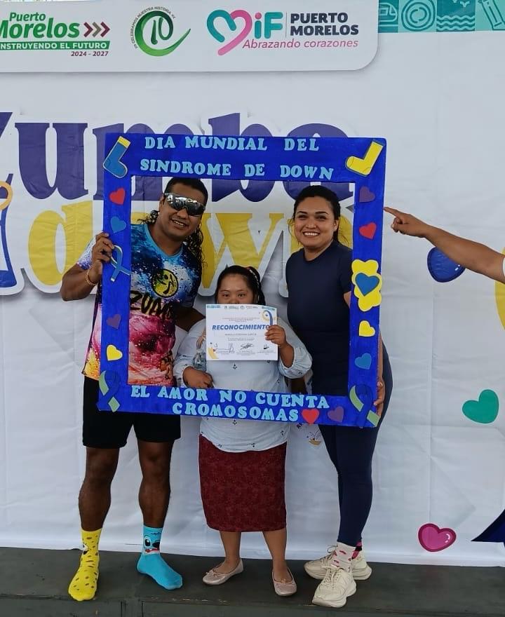 Puerto Morelos, Quintana Roo a 21 de marzo 2026.— Con gran entusiasmo y participación, el Sistema DIF Puerto Morelos llevó a cabo el evento Zumba Down, Bailando con el corazón, una actividad enfocada en promover la inclusión, la activación física y la sana convivencia en el marco del Día Mundial del Síndrome de Down, encuentro en el que participaron más de 30 personas, entre ellas niñas, niños, jóvenes y adultos con discapacidad, así como sus familias, quienes disfrutaron de una jornada llena de energía, música y unión.