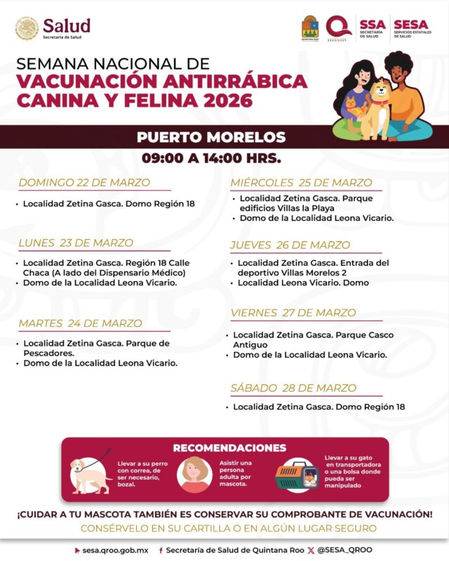 El municipio de Puerto Morelos, encabezado por la presidenta municipal Blanca Merari Tziu Muñoz, se sumó a la “Semana Nacional de Vacunación Antirrábica Canina y Felina 2026”, coordinada por el Centro Nacional de Prevención y Control de Enfermedades del Gobierno de México, en vinculación con el área de Vectores de la Secretaría de Salud de Quintana Roo, del 22 al 28 de marzo.