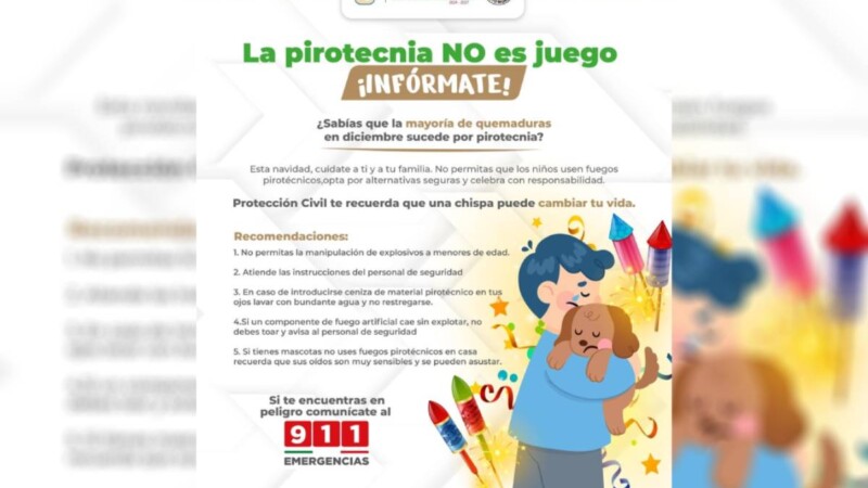 En este contexto, el gobierno municipal lanzó la campaña “La pirotecnia no es un juego”, con la que se busca concientizar sobre los riesgos asociados al uso de fuegos artificiales. Protección Civil recuerda que la mayoría de las quemaduras que se registran en diciembre están relacionadas con la pirotecnia y advierte que una chispa puede cambiar la vida de una persona, por lo que invita a cuidar de las familias y evitar que niñas y niños manipulen estos productos, promoviendo celebraciones seguras y responsables.