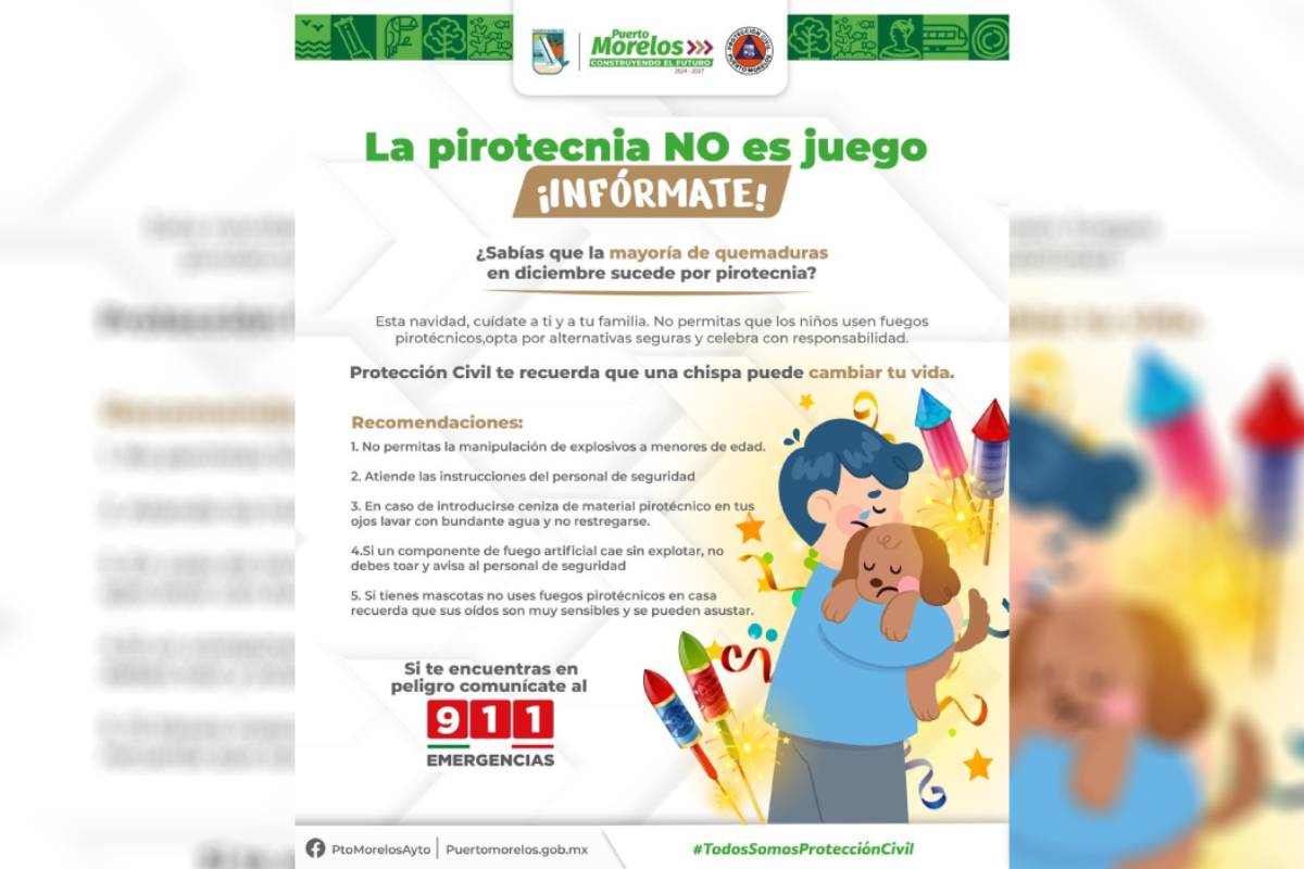 En este contexto, el gobierno municipal lanzó la campaña “La pirotecnia no es un juego”, con la que se busca concientizar sobre los riesgos asociados al uso de fuegos artificiales. Protección Civil recuerda que la mayoría de las quemaduras que se registran en diciembre están relacionadas con la pirotecnia y advierte que una chispa puede cambiar la vida de una persona, por lo que invita a cuidar de las familias y evitar que niñas y niños manipulen estos productos, promoviendo celebraciones seguras y responsables.