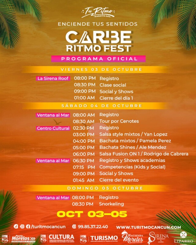 Este sábado, a partir de las 3 de la tarde, se llevarán a cabo talleres de salsa y bachata en el Centro Cultural y Museo de Puerto Morelos, para cerrar con un gran show y competencia de baile en la explanada del Parque Fundadores, donde participarán alumnas y alumnos de academias locales y de municipios vecinos.