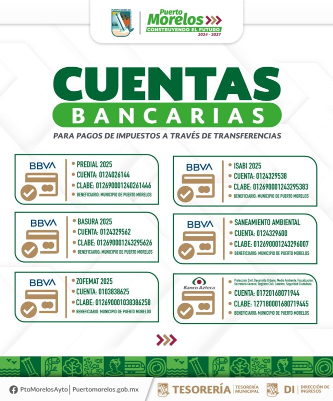 Para el ISABI (Impuesto de Adquisición de Bienes Inmuebles) BBVA 0124329538 – Clabe 012690001243295383; Saneamiento Ambiental BBVA 0124329600 – Clabe 012690001243296007; para las áreas de Protección Civil, Desarrollo Urbano, Medio Ambiente, Fiscalización, Secretaría General, Registro Civil, Catastro y Seguridad Ciudadana en Banco Azteca 01720168071944 – Clabe 127180001680719445.
