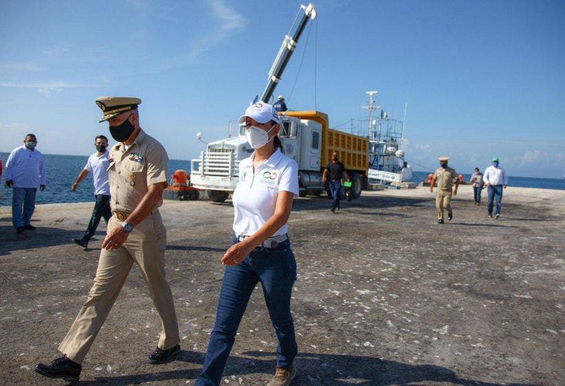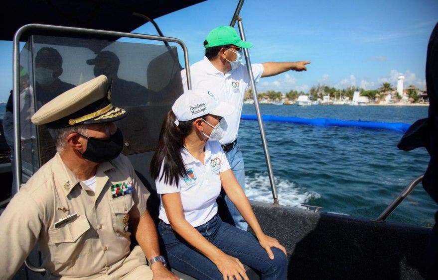Posteriormente, Laura Fernández y el Contraalmirante Enrique Flores Morado, quien también es director general adjunto de Oceanografía, Hidrografía y Meteorología de la Semar, abordaron una lancha de la dependencia para recorrer la franja costera del destino, en la que se han colocado barreras marinas para contener y direccionar el sargazo a puntos específicos de las playas para su recolección.