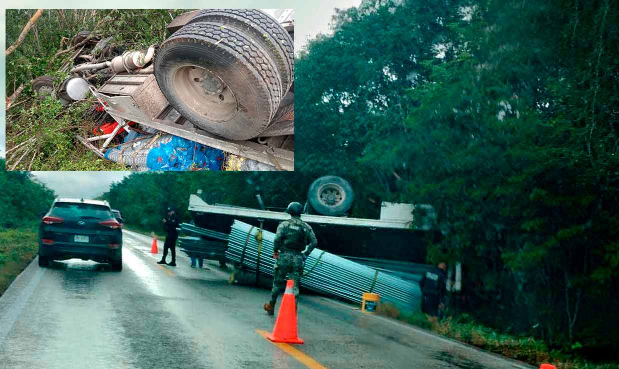 Un camión que transportaba productos para la construcción, vuelca aparatosamente en el tramo carretero Leona Vicario – Valladolid Nuevo, resultando el chofer de la unidad con lesiones leves.