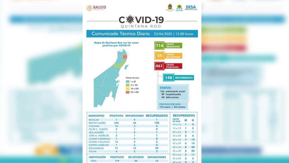 461 casos positivos de coronavirus se registran en Quintana Roo.- La propagación del coronavirus en Quintana Roo continúa a la alza y suma 35 casos nuevos con lo que se alcanzó la cifra de 461 contagiados, además de que a la fecha son 60 defunciones.