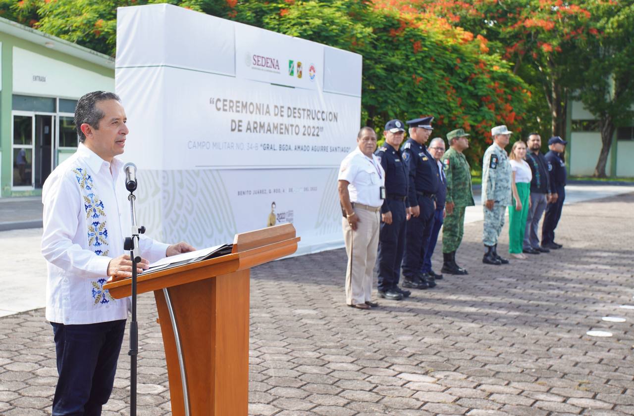 En el marco de la destrucción de armamento decomisado por la Secretaría de la Defensa Nacional, el gobernador Carlos Joaquín advirtió a “quienes quieran desestabilizar las instituciones, para quienes quieran generar pánico y destruir todo lo que se ha construido con el esfuerzo de todas y todos, existe una sola expresión muy enfática. ¡Aquí no se los vamos a permitir!”