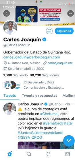 Advierte Carlos Joaquín crecimiento en curva de contagio.- El gobernador del Estado, Carlos Joaquín González, advirtió en sus redes sociales que la curva de contagios está creciendo en Chetumal, lo que podría implicar el regreso al color rojo en el semáforo estatal.