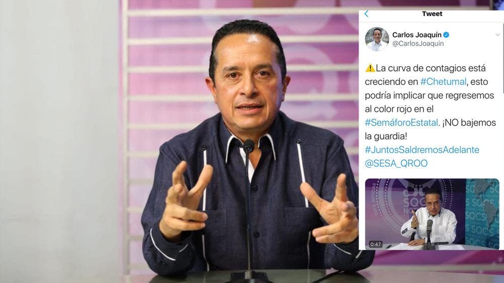 Advierte Carlos Joaquín crecimiento en curva de contagio.- El gobernador del Estado, Carlos Joaquín González, advirtió en sus redes sociales que la curva de contagios está creciendo en Chetumal, lo que podría implicar el regreso al color rojo en el semáforo estatal.