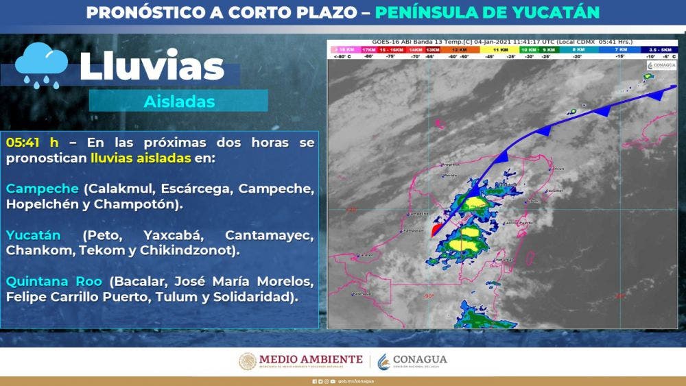 La Dirección de la Conagua en Quintana Roo dio a conocer que desde este 4 de enero se pronostican intervalos de chubascos con lluvias puntuales fuertes de 25 a 50 milímetros de precipitación pluvial, acompañadas de descargas eléctricas y rachas fuertes de viento.