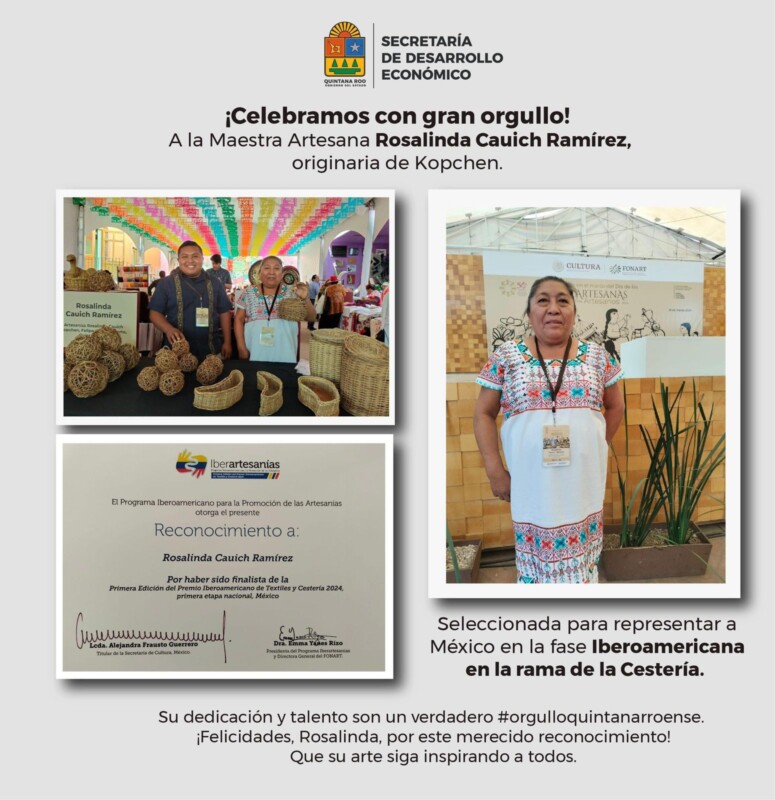 La gobernadora Mara Lezama Espinosa expresó su satisfacción y felicitó a Rosalinda Cauich, orgullo quintanarroense, quien confirma una vez más que las manos mágicas de mujeres y hombres dedicadas a la labor artesanal elaboran productos de alto valor artístico que generan bienestar social y prosperidad compartida que el mundo merece conocer.