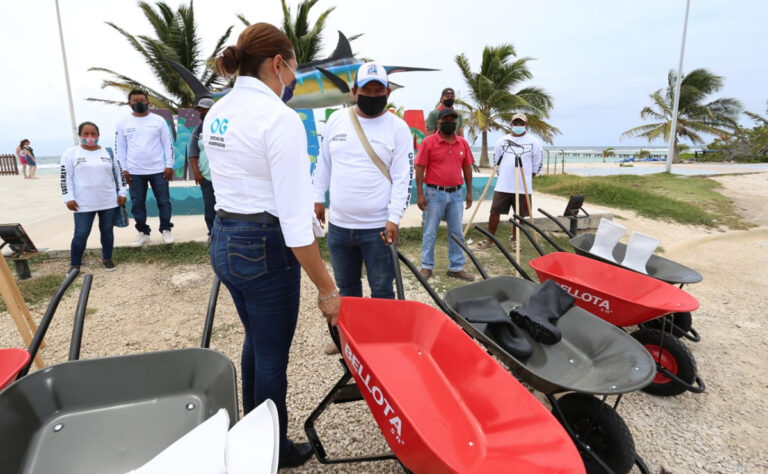 La primera entrega de herramientas e insumos que se realizó en días pasados, estuvo a cargo del personal de la Oficina del Gobernador y del titular de la Secretaría de Ecología y Medio Ambiente (SEMA) Efraín Villanueva Arcos y personal de la 11ª Zona Naval Militar, quienes entregaron 10 carretillas, 10 bieldos y 10 rastrillos a artesanos y restauranteros de Mahahual.