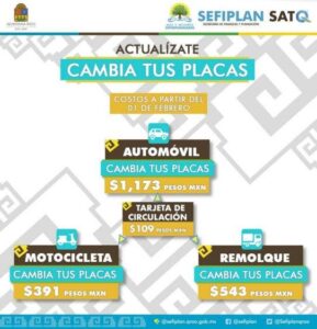 Derivado de lo anterior la SEFIPLAN informa sus nuevos costos para el canje de placas, las cuales tendrán un valor de 1,173 pesos para automóviles, para motocicletas tendrán un costo de 391 pesos; para remolque 543 pesos más la tarjeta de circulación de 109 pesos.