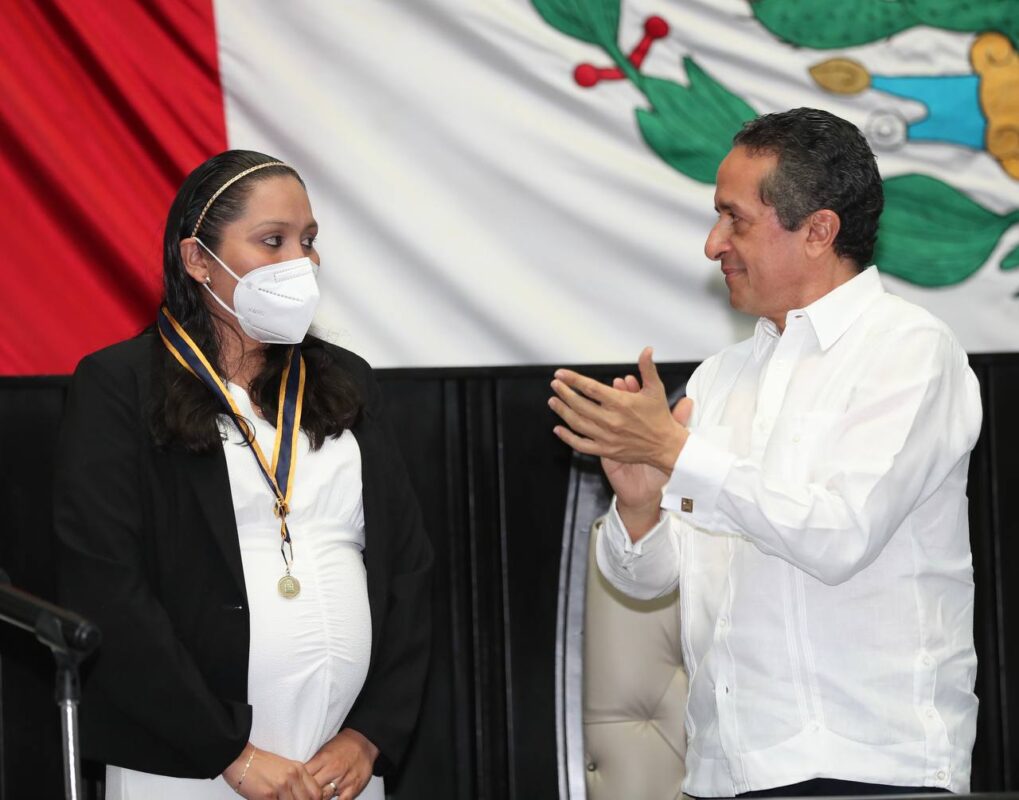 La medalla al Mérito fue entregada a Bianca Fabiola Pech Dzib y a Jesús Gabriel Dzul Piña por su destacada labor realizada a favor de los ciudadanos de Quintana Roo, durante una sesión solemne que para tal efecto convocó el Congreso del Estado.