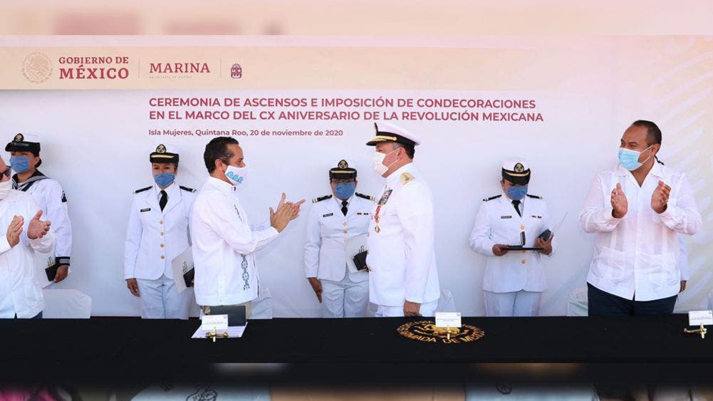 En la Quinta Región Naval de #IslaMujeres conmemoramos el 110 Aniversario de la #RevoluciónMexicana, con la Ceremonia de Ascensos e Imposición de Condecoraciones a elementos de la @SEMAR_mx, que con compromiso y entrega han servido a #QuintanaRoo. #JuntosSaldremosAdelante pic.twitter.com/xYvn9kaaoB