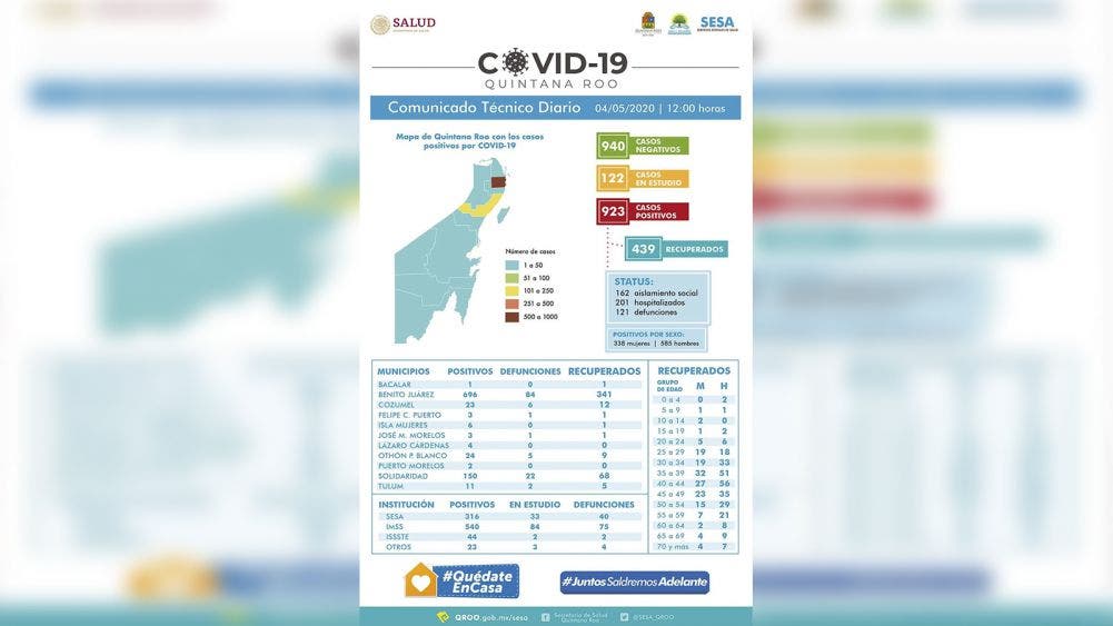Cifras de Covid se mantienen estables en Quintana Roo.- Quintana Roo reportó 11 nuevos casos, así como una defunción por COVID 19, en 24 horas así un acumulado de 923 positivos, 439 recuperados, 162en aislamiento social, 201 personas hospitalizadas, y 121 decesos por esta causa, informó en su último reporte del 4 de mayo la Secretaría de Salud.