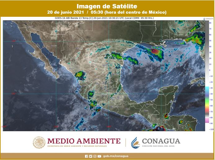 Pacífico Norte: Cielo nublado con lluvias puntuales intensas en Sinaloa y fuertes en Sonora, ambas con descargas eléctricas, posible caída de granizo en Sonora. Ambiente fresco al amanecer y muy caluroso durante la tarde. Viento del suroeste de 25 a 35 km/h con rachas de 60 a 70 km/h en Sonora.