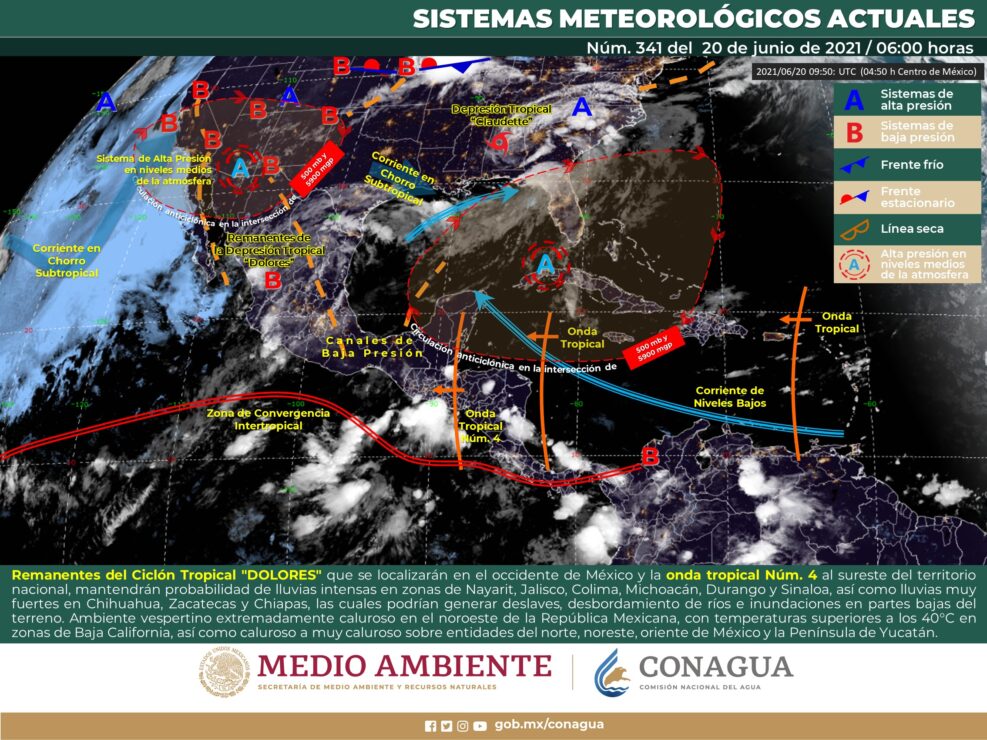 Clima: Cielo nublado y con chubascos aislados en Quintana Roo. >Para hoy, los remanentes del Ciclón Tropical «Dolores» que se localizarán en el occidente de México y la onda tropical Núm. 4 al sureste del territorio nacional, mantendrán la probabilidad de lluvias intensas en zonas de Nayarit, Jalisco, Colima, Michoacán, Durango y Sinaloa, así como lluvias puntuales muy fuertes en Chihuahua, Zacatecas y Chiapas, las cuales podrían generar deslaves, desbordamiento de ríos e inundaciones en partes bajas del terreno. Finalmente, se mantendrá el ambiente vespertino extremadamente caluroso en el noroeste de la República Mexicana, con temperaturas superiores a los 40°C en zonas de Baja California, así como ambiente caluroso a muy caluroso sobre entidades del norte, noreste, oriente de México y la Península de Yucatán.