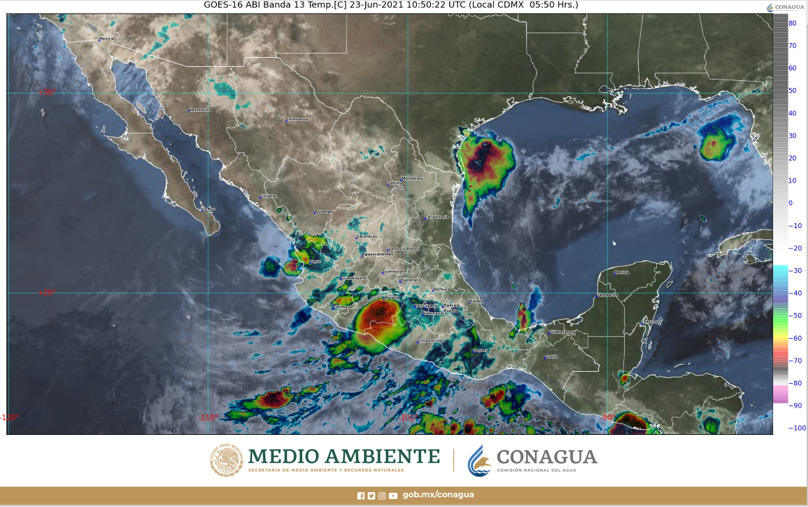 Por otra parte, la onda tropical número 5 recorrerá el sureste y sur de la República Mexicana, y se asociará con una zona de baja presión con potencial ciclónico sobre el Golfo de Tehuantepec, estos sistemas originarán lluvias fuertes a muy fuertes, descargas eléctricas y posibles granizadas en zonas del sureste, sur y oriente del territorio nacional, incluida la Península de Yucatán; con lluvias puntuales intensas en Guerrero, Oaxaca y Chiapas. También se mantendrá el ambiente caluroso a muy caluroso sobre entidades del noroeste, norte, noreste y sureste de México, incluida la Península de Yucatán.