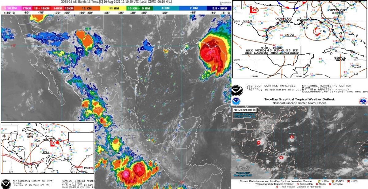 Clima: ‘Grace’ se degrada a depresión tropical en el mar Caribe. Entrada de aire marítimo tropical con variado contenido de humedad procedente del mar Caribe hacia la Península de Yucatán, genera nubosidad variable con posibilidades lluvias ocasionales aisladas, así como nubes de tormentas acompañados de actividad eléctrica, temperaturas calurosas a muy caluroso, viento fresco y arrachado del sur variando al sureste, principalmente en la Zona sur del Quintana Roo, después de mediodía.