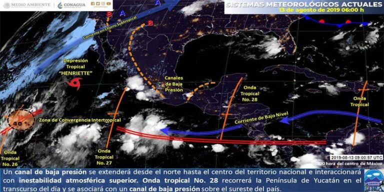 Clima probable para hoy en Quintana Roo; la onda tropical 28 impulsa la entrada de aire marítimo tropical con variable contenido de humedad a la Península.