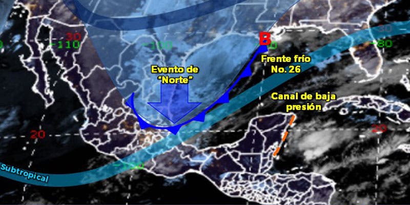 Para hoy se pronostica que el frente frío número 26 se extienda desde el noreste del Golfo de México hasta el sur del país, y un canal de baja presión sobre la Península de Yucatán, ocasionarán lluvias puntuales intensas en Tabasco, Chiapas, Campeche, Yucatán y Quintana Roo, así como muy fuertes en Veracruz y Oaxaca.