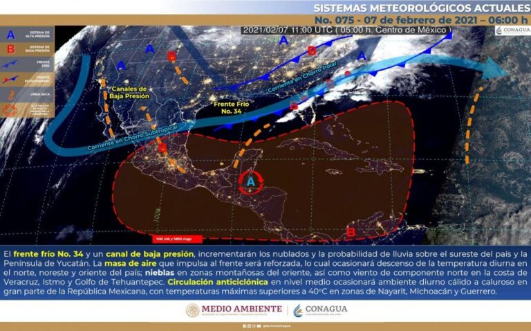 Clima: Pronóstico del tiempo para hoy domingo 8 de febrero. Para este día, el frente frío número 34 se desplazará sobre el sureste mexicano e interaccionará gradualmente con un canal de baja presión sobre la Península de Yucatán; ambos sistemas incrementarán los nublados y la probabilidad de lluvia sobre dichas regiones.