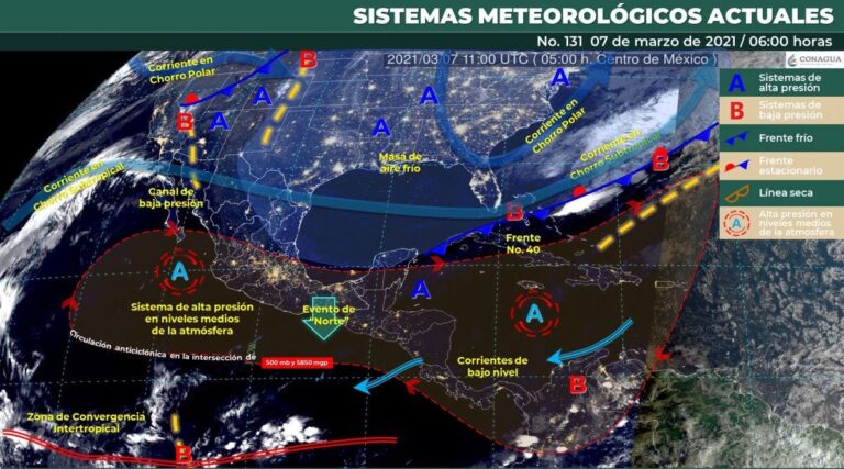 La masa de aire asociada al frente empezará a modificar sus características térmicas, sin embargo, interaccionará con un canal de baja presión sobre el suroeste del Golfo de México, manteniendo nublados y condiciones para lluvias en el noreste, oriente y sureste del territorio nacional, así como evento de «norte» en la Península de Yucatán e Istmo y Golfo de Tehuantepec.