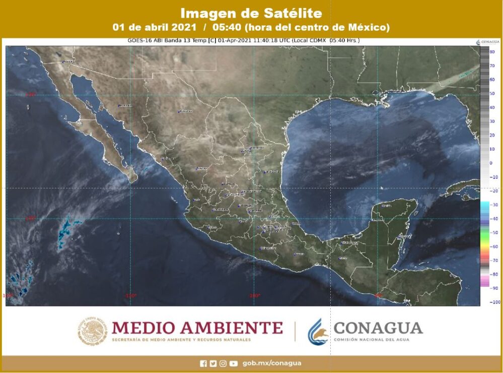 Valle de México: Cielo medio nublado, con bruma y humo durante el día. Ambiente fresco matutino y cálido por la tarde en gran parte de la región, así como ambiente caluroso en zonas del suroeste del Estado de México. Lluvias aisladas en zonas de la Ciudad de México y en el Estado de México. Viento del noreste de 15 a 30 km/h con rachas de 60 a 70 km/h y posibles tolvaneras.