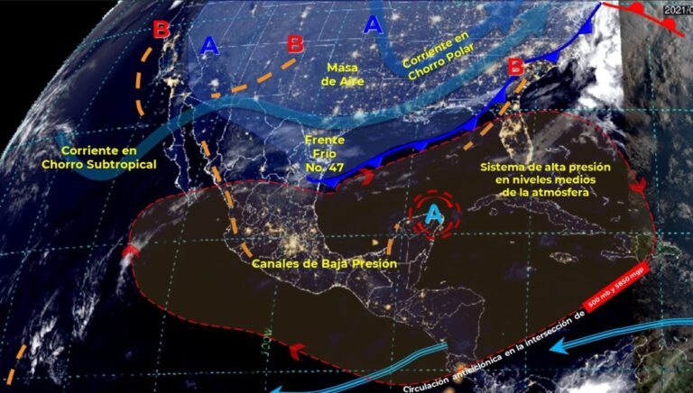 La masa de aire asociada, ocasionará descenso de temperaturas, con ambiente muy frío en zonas serranas del norte y ambiente frío en sierras del noreste, oriente y centro del territorio, además de evento de “norte” fuerte a intenso en el litoral del Golfo de México, Istmo y Golfo de Tehuantepec, así como fuertes rachas de viento con posibles tolvaneras en estados del norte, noreste y centro del país.