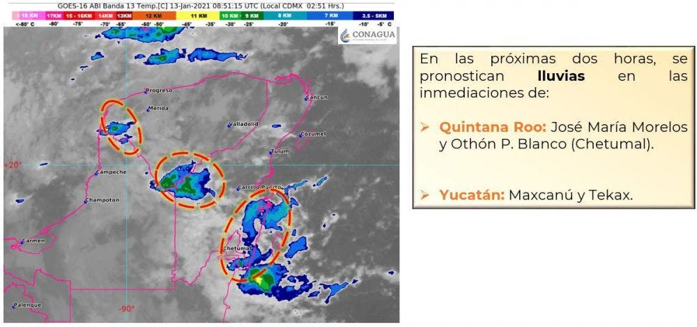 Península de Yucatán: Cielo nublado con lluvias puntuales muy fuertes en Campeche, Yucatán y Quintana Roo. Ambiente cálido y evento de «Norte» con rachas de 50 a 60 km/h y oleaje de 1 a 2 m de altura en costas de la región.