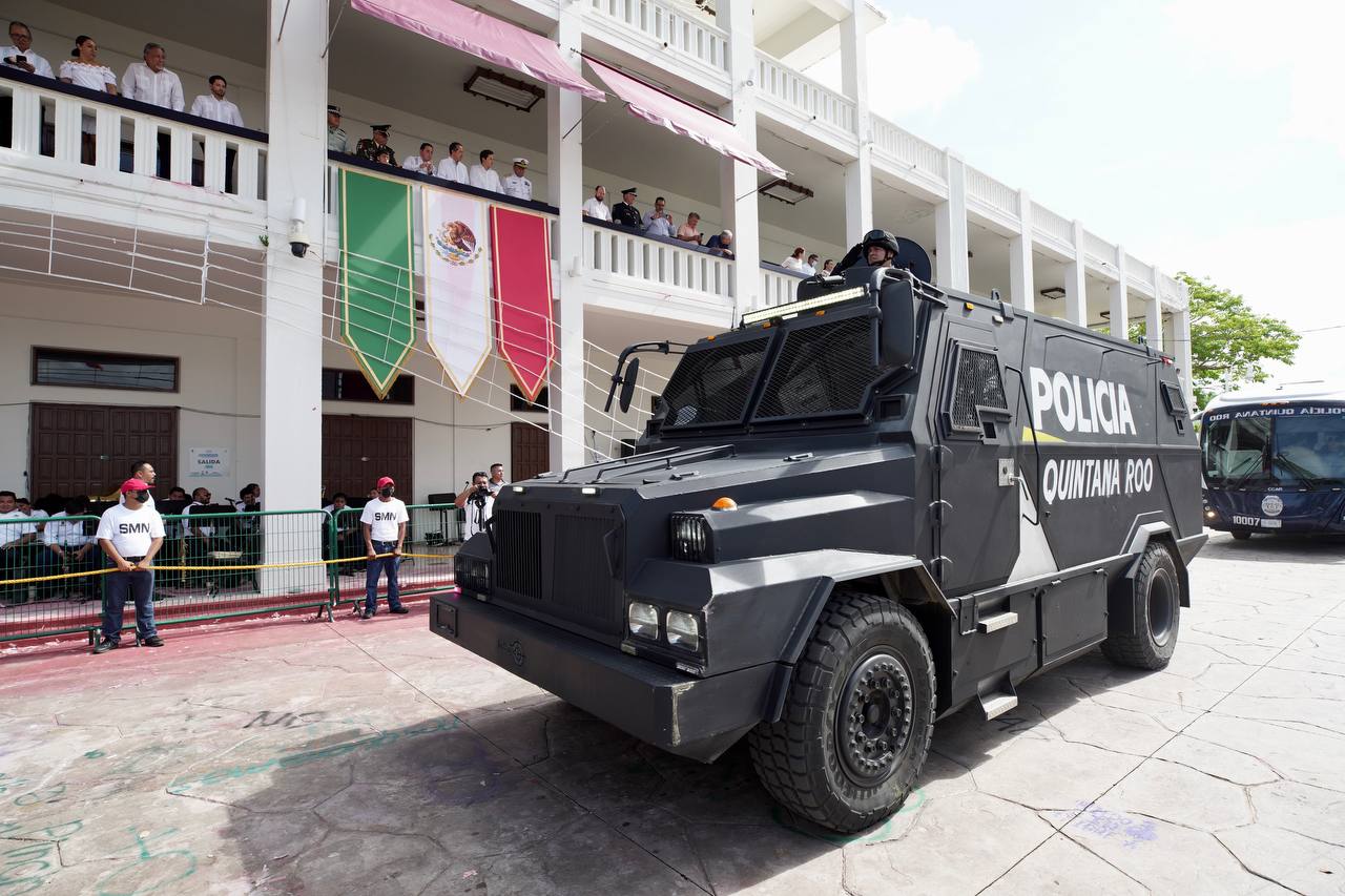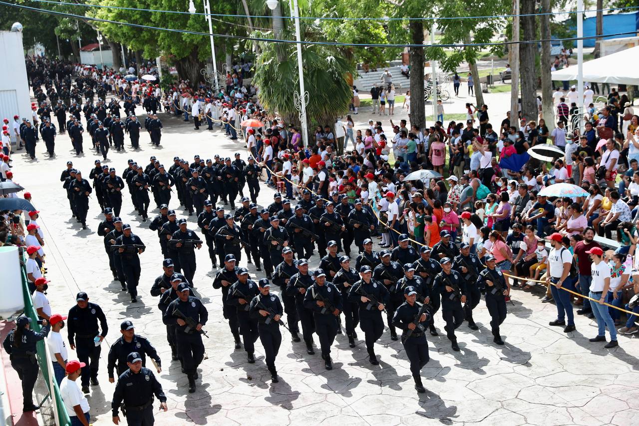 El desfile dio inicio con la descubierta encabezada por los motopatrulleros de la Dirección Estatal de Tránsito, la banda de guerra “Titanes de Chetumal” y las escoltas de bandera de la Secretaría de Seguridad Pública.