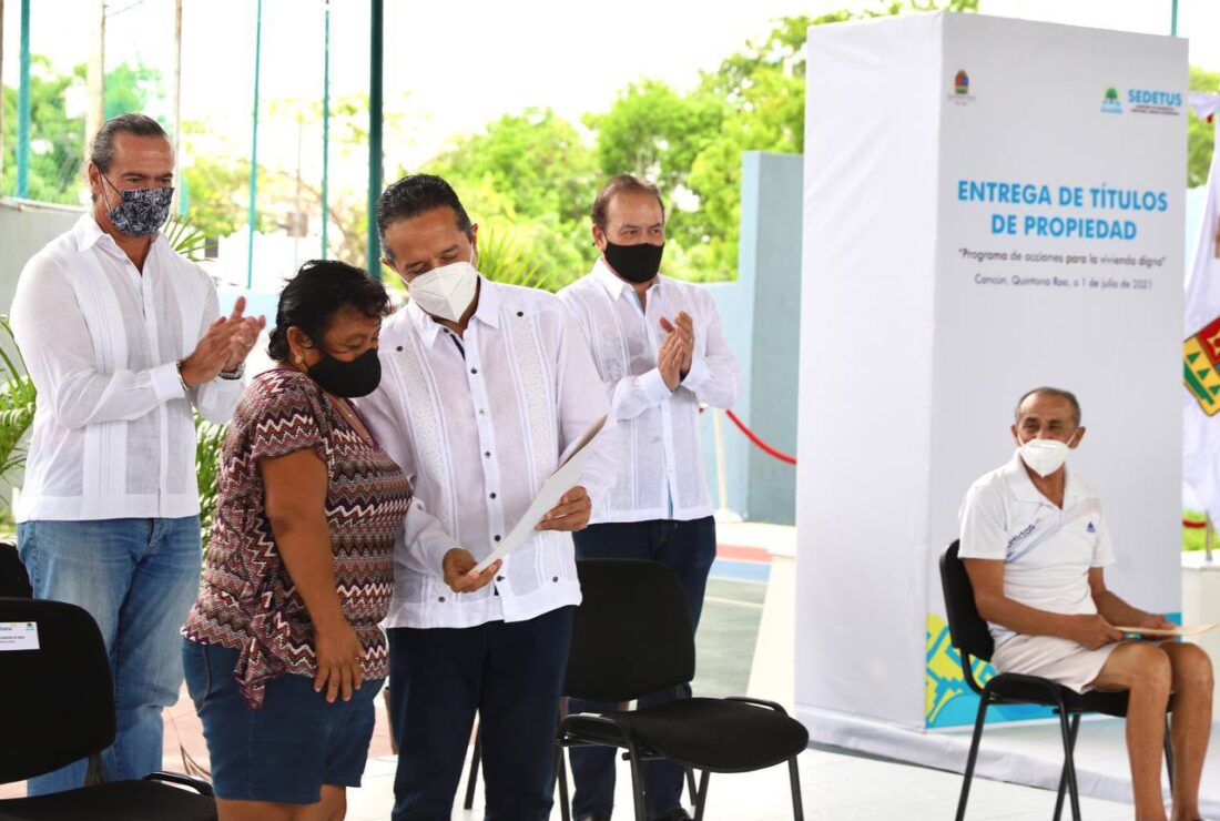“Hace unos días estuvimos en Cozumel, en Chetumal y en Playa del Carmen y hoy entregamos títulos de propiedad aquí en Cancún. Tener un título de propiedad es garantizar el patrimonio de nuestras familias, consolidar nuestros hogares y nuestro porvenir, reiteró el titular del ejecutivo.