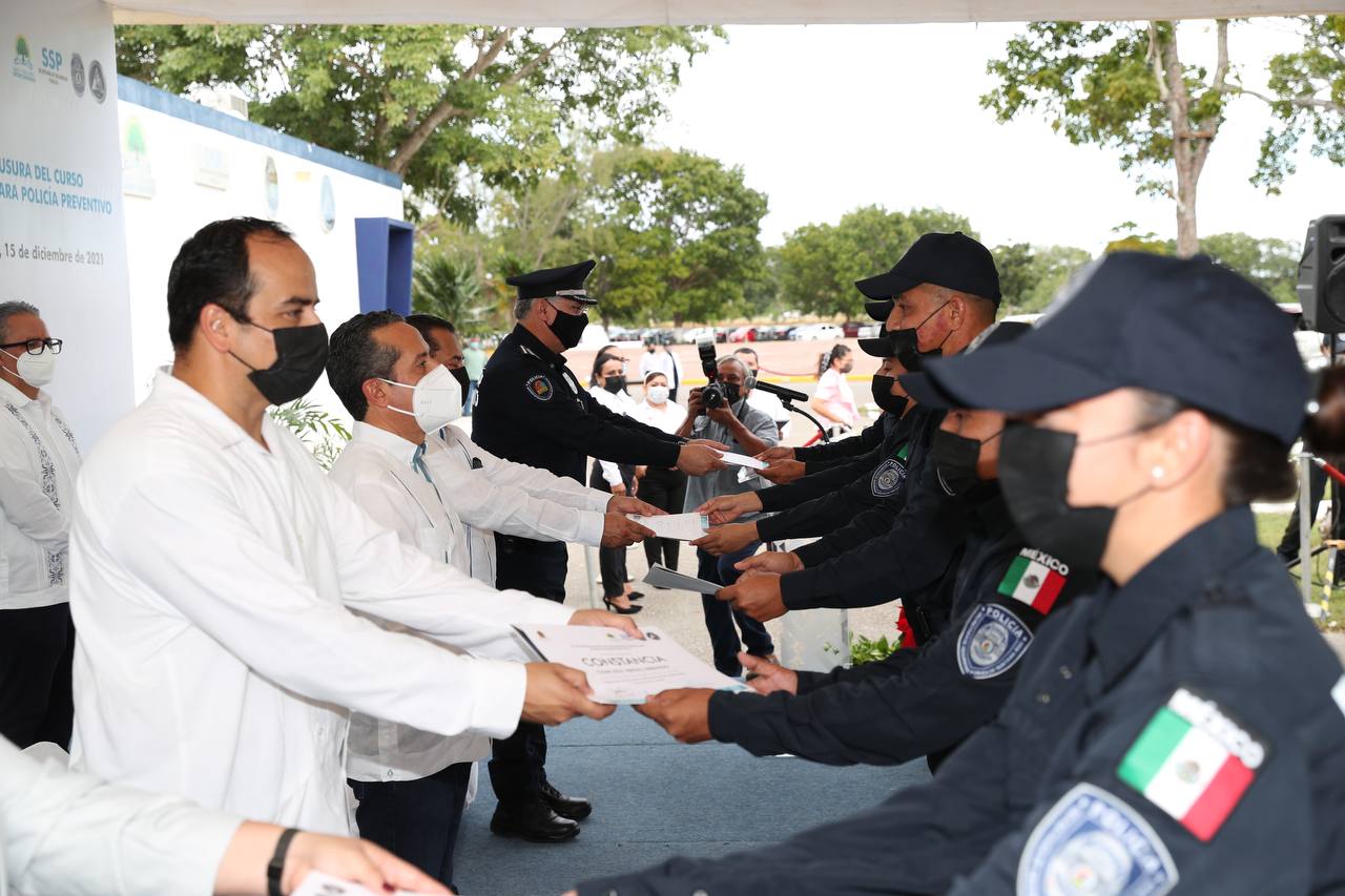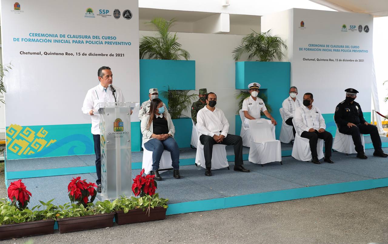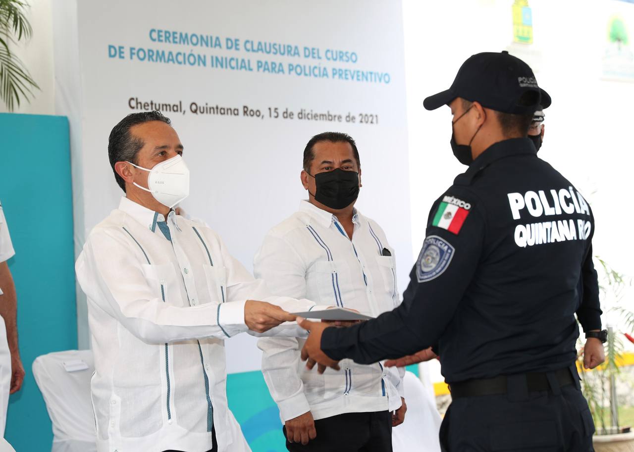 El gobernador de Quintana Roo encabezó la ceremonia de clausura del Curso de Formación Inicial para Policía Preventivo que se llevó a cabo en la explanada de la Academia de Policía y en la que se entregaron reconocimientos y constancias.