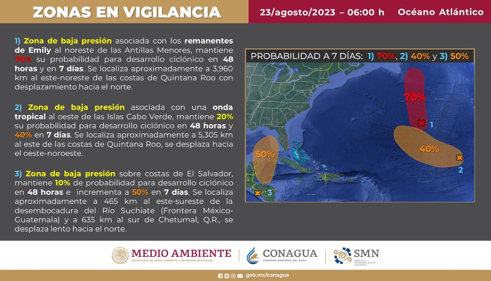 Este panorama de mal clima, sería debido a los efectos de una zona de baja presión que se ubica en las costas de El Salvador y se desplaza lentamente hacia el norte, es decir hacia el Caribe Mexicano.