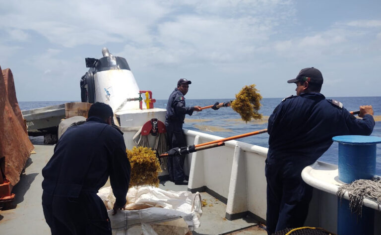 También se encuentran dos buques sargaceros más en la comunidad de Mahahual, donde realizan trabajos de limpieza en las inmediaciones de las costas.