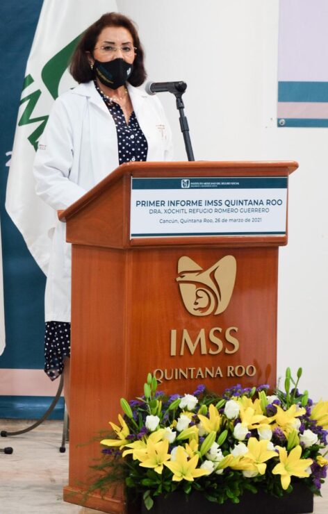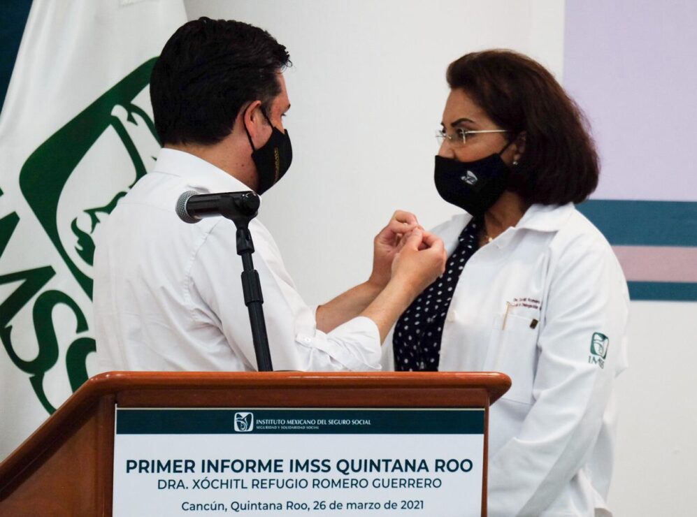 En su mensaje, el director general del Instituto Mexicano del Seguro Social (IMSS), Maestro Zoé Robledo, reconoció a la doctora Xóchitl Refugio Romero Guerrero, primera mujer representante del Seguro Social en Quintana Roo, por su destacada labor y liderazgo.