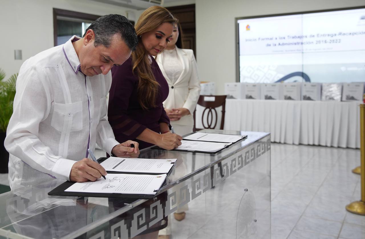 El gobernador Carlos Joaquín y la gobernadora electa Mara Lezama firmaron hoy el Acta de Avances al iniciar formalmente los trabajos de entrega-recepción de la administración 2016-2022.