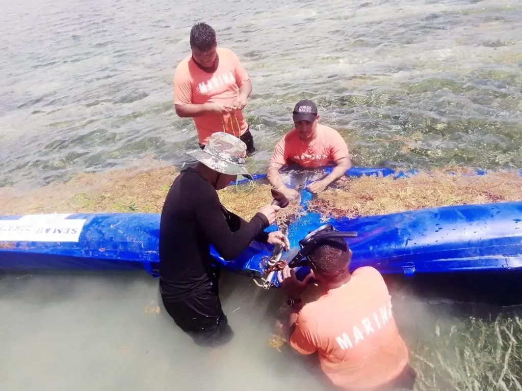 Con base en la estrategia para la Atención del Recale Masivo de Sargazo en las Costas de Quintana Roo, liderada por la Secretaría de Marina, fueron instalados de manera exitosa mil 400 metros de barrera para contener el arribo de la macroalga en Mahahual, municipio de Othón P. Blanco.