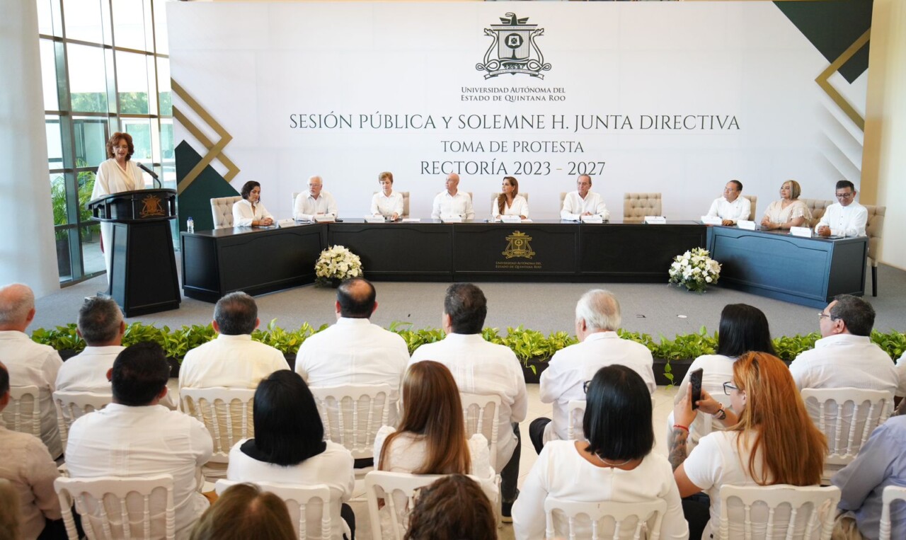 Con pleno respeto a la autonomía universitaria, la gobernadora Mara Lezama Espinosa asistió a la Sesión Pública y Solemne de la Junta Directiva de toma de protesta de la Rectoría de la Universidad Autónoma de Quintana Roo (UQROO) 2023-2027, que dirige la doctora Consuelo Natalia Fiorentini Cañedo.