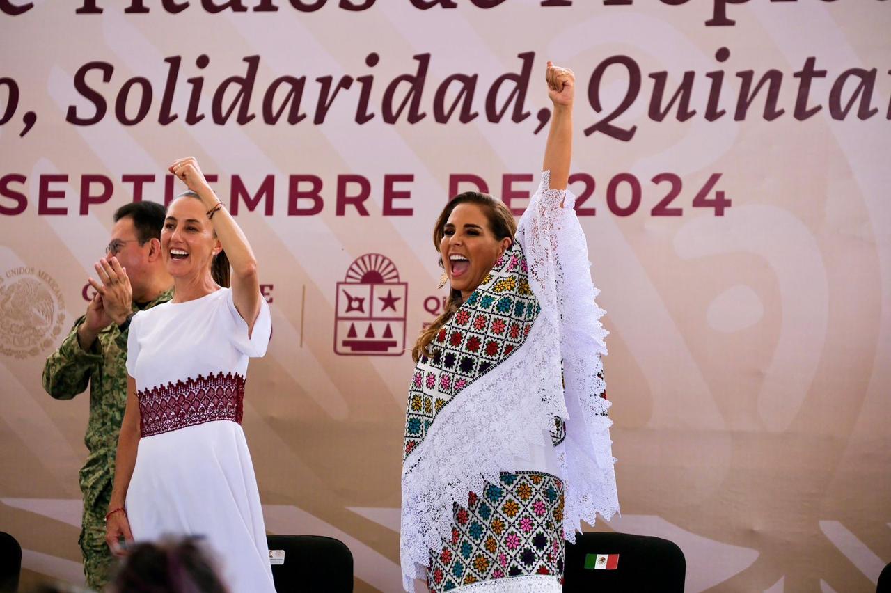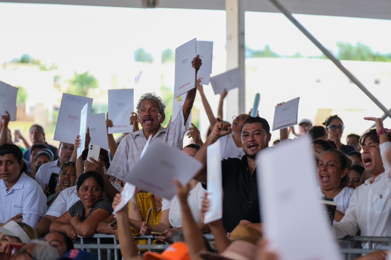 El presidente Andrés Manuel López Obrador, la presidenta electa Claudia Sheinbaum y la gobernadora Mara Lezama Espinosa entregaron hoy los primeros mil 774 títulos de propiedad, de un total de 3 mil 913 lotes, a habitantes de la colonia Colosio, en un acto histórico que culmina con una larga etapa de incertidumbre y desesperanza y que cumple con la palabra presidencial de resolver este problema.