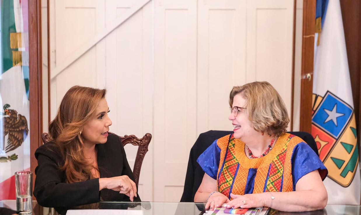 La gobernadora de Quintana Roo Mara Lezama Espinosa, se reunió con la titular de INMUJERES, Nadine Gasman Zylbermann, para trabajar coordinadas en impulsar acciones para que las instancias de las mujeres en las entidades federativas, formen parte de las mesas de paz y seguridad, que puedan tener voz e impulsar la perspectiva de género en la materialización de la Estrategia de Paz y Seguridad en el país desde la Comisión de Igualdad de la Conferencia Nacional de Gobernadores (Conago).