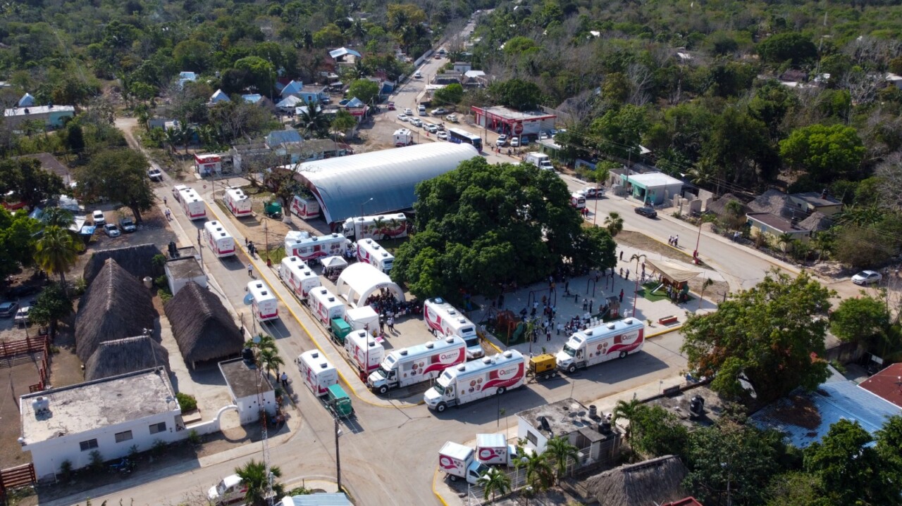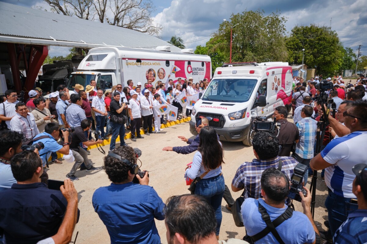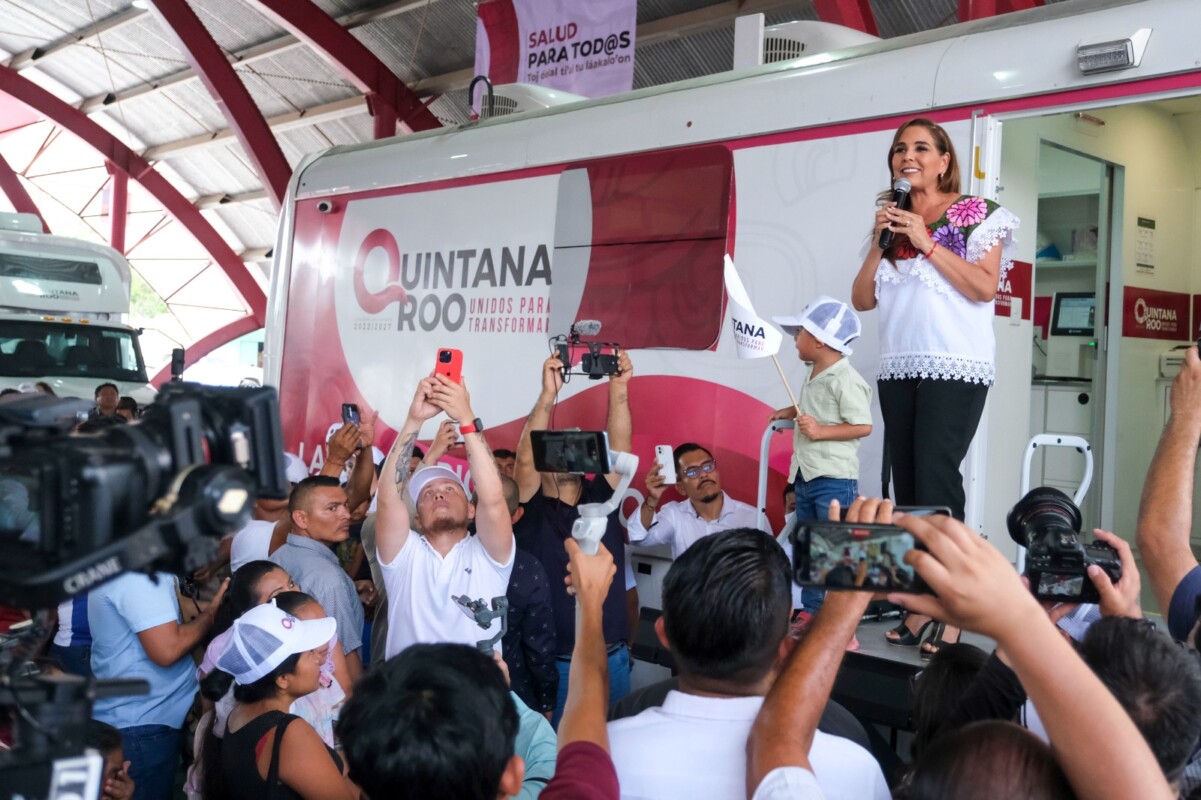 Desde el domo de Chumpón, acompañada de las y los presidentes municipales y tras recorrer cada una de las unidades estacionadas alrededor, Mara Lezama informó a los y las quintanarroenses que hoy inician operaciones las unidades médicas móviles.