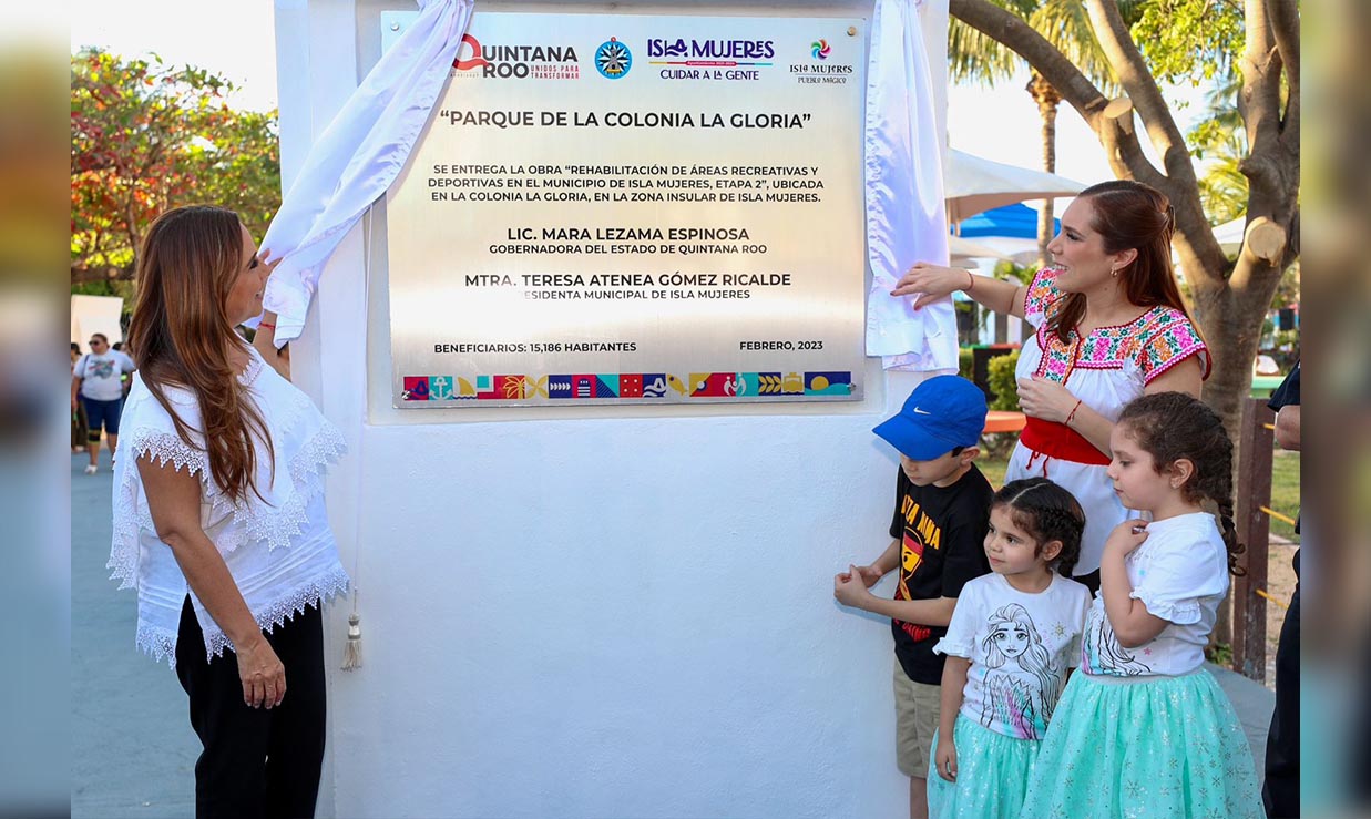 La gobernadora Mara Lezama Espinosa y la presidenta municipal, Atenea Gómez Ricalde encabezaron la reinauguración del parque La Gloria, un espacio público rehabilitado para que las familias y turistas tengan un sitio social de convivencia y esparcimiento.