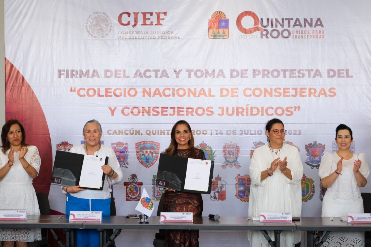 Aplaudo esta iniciativa de constituir el Colegio Nacional de Consejeras y Consejeros Jurídicos, expresó la gobernadora Mara Lezama Espinosa al atestiguar la firma del acta constitutiva y toma de protesta de la primera mesa directiva de esta organización que, confió, estará al servicio del pueblo, de los que menos tienen.