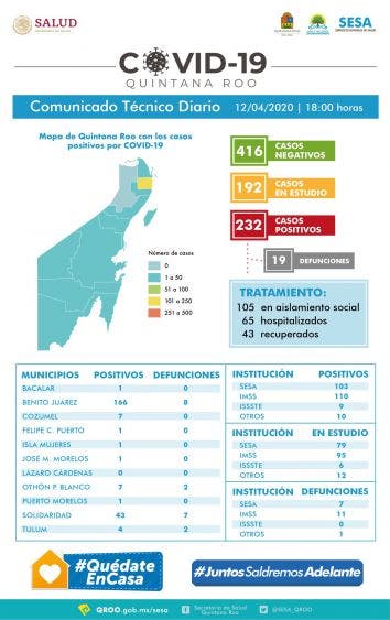 Siguen aumentando los muertos y positivos por Covid-19 en Quintana Roo, van 19.- Sigue aumentando la cifra de fallecidos y de casos positivos de Coronavirus Covid-19 en Quintana Roo, pues con los dos fallecidos de hoy, la números se mueven a 19 muertos y 232 casos positivos oficialmente reconocidos por las autoridades sanitarias del estado encabezadas por la secretaria Alejandra Aguirre Crespo.