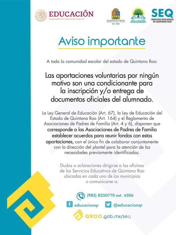 Luego de las innumerables quejas de los padres de familia al respecto, a dos días del regreso a clases, la dependencia, a través de sus redes sociales, dio a conocer que de acuerdo con la Ley General de Educación (Art.67) la Ley de Educación del Estado de Quintana Roo (Art. 164) y el reglamento de Asociaciones de Padre de Familia (Art. T y 6) establecen que: