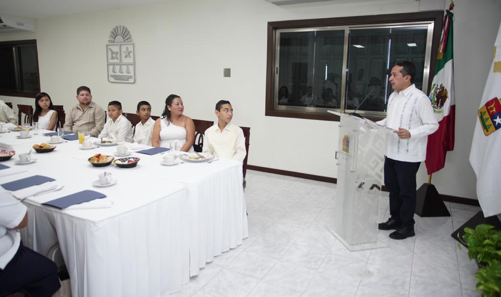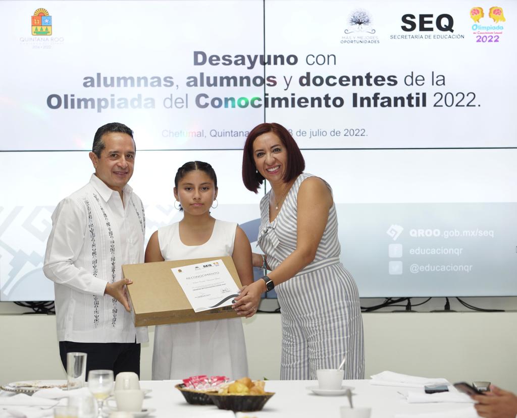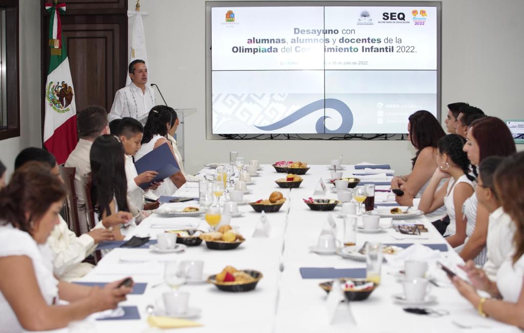 El gobernador Carlos Joaquín, acompañado de la titular de la Secretaría de Educación de Quintana Roo (SEQ) Ana Isabel Vásquez Jiménez, ofreció un convivio a las 10 niñas, niños y sus docentes ganadores de la Olimpiada del Conocimiento Infantil (OCI) 2022, para entregarles un reconocimiento a su esfuerzo, así como los premios que otorga el Gobierno del Estado.