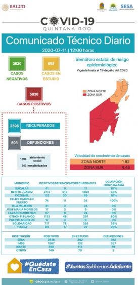 El panorama actual para el estado de Quintana Roo, muestra que se tienen 5 mil 030 casos positivos acumulados, de los cuales mil 369 son casos activos estimados, siendo el municipio de Benito Juárez el mas afectado, con 2712 casos acumulados totales, seguido por los municipios de Puerto Morelos, Othón P. Blanco, Solidaridad y Cozumel.