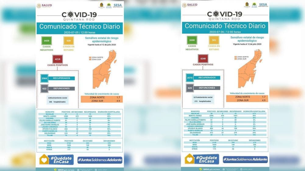 Y es que al corte del 6 de julio dice que son 7 defunciones y 28 casos nuevos, 16 en OPB y 13 en Benito Juárez que sumarían 29 y 28, pero además no se contempla un caso en Bacalar y 2 en Cozumel por lo que el total sería de 32 casos nuevos al corte de este día, además de que Solidaridad y Tulum aparecen con menos casos que un día antes.