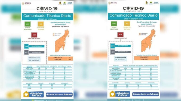Y es que al corte del 6 de julio dice que son 7 defunciones y 28 casos nuevos, 16 en OPB y 13 en Benito Juárez que sumarían 29 y 28, pero además no se contempla un caso en Bacalar y 2 en Cozumel por lo que el total sería de 32 casos nuevos al corte de este día, además de que Solidaridad y Tulum aparecen con menos casos que un día antes.